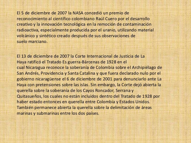 - i. El 5 de diciembre de 2007 la NASA concedió un premio de reconocimiento al científico colombiano Raúl Cuero por el desarrollo creativo y la innovación tecnológica en la remoción de contaminación radioactiva, especialmente producida por el uranio, utilizando material volcánico y sintético creado después de sus observaciones de suelo marciano.El 13 de diciembre de 2007 la Corte Internacional de Justicia de La Haya ratificó el Tratado Es guerra-Bárcenas de 1928 en el cual Nicaragua reconoce la soberanía de Colombia sobre el Archipiélago de San Andrés, Providencia y Santa Catalina y que fuera declarado nulo por el gobierno nicaragüense el 6 de diciembre de 2001 para denunciarlo ante La Haya con pretensiones sobre las islas. Sin embargo, la Corte dejó abierta la querella sobre la soberanía de los Cayos Roncador, Serrana y Quitasueños, los cuales no están incluidos dentro del Tratado de 1928 por haber estado entonces en querella entre Colombia y Estados Unidos. También permanece abierta la querella sobre la delimitación de áreas marinas y submarinas entre los dos países.