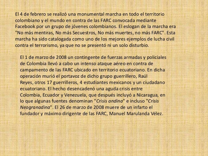 - J. El 4 de febrero se realizó una monumental marcha en todo el territorio colombiano y el mundo en contra de las FARC convocada mediante Facebook por un grupo de jóvenes colombianos. El eslogan de la marcha era "No más mentiras, No más Secuestros, No más muertes, no más FARC". Esta marcha ha sido catalogada como uno de los mejores ejemplos de lucha civil contra el terrorismo, ya que no se presentó ni un solo disturbio.El 1 de marzo de 2008 un contingente de fuerzas armadas y policiales de Colombia llevó a cabo un intenso ataque aéreo en contra de campamento de las FARC ubicado en territorio ecuatoriano. En dicha operación murió el portavoz de dicho grupo guerrillero, Raúl Reyes, otros 17 guerrilleros, 4 estudiantes mexicanos y un ciudadano ecuatoriano. El hecho desencadenó una aguda crisis entre Colombia, Ecuador y Venezuela, que después incluyó a Nicaragua, en lo que algunas fuentes denominan "Crisis andina" e incluso "Crisis Neogranadina". El 26 de marzode 2008 muere de un infarto el fundador y máximo dirigente de las FARC, Manuel Marulanda Vélez.