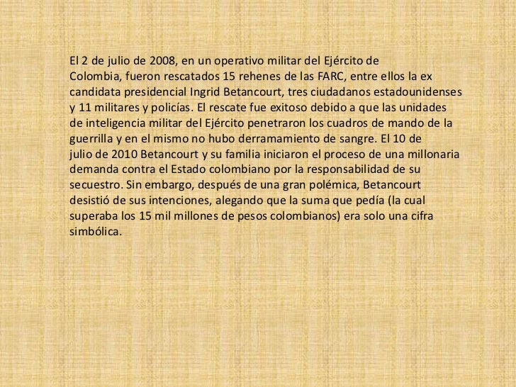 - k. El 2 de julio de 2008, en un operativo militar del Ejército de Colombia, fueron rescatados 15 rehenes de las FARC, entre ellos la ex candidata presidencial Ingrid Betancourt, tres ciudadanos estadounidenses y 11 militares y policías. El rescate fue exitoso debido a que las unidades de inteligencia militar del Ejército penetraron los cuadros de mando de la guerrilla y en el mismo no hubo derramamiento de sangre. El 10 de julio de 2010 Betancourt y su familia iniciaron el proceso de una millonaria demanda contra el Estado colombiano por la responsabilidad de su secuestro. Sin embargo, después de una gran polémica, Betancourt desistió de sus intenciones, alegando que la suma que pedía (la cual superaba los 15 mil millones de pesos colombianos) era solo una cifra simbólica.