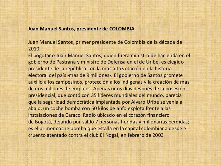 - L. Juan Manuel Santos, presidente de COLOMBIA Juan Manuel Santos, primer presidente de Colombia de la década de 2010.El bogotano Juan Manuel Santos, quien fuera ministro de hacienda en el gobierno de Pastrana y ministro de Defensa en el de Uribe, es elegido presidente de la república con la más alta votación en la historia electoral del país -mas de 9 millones-. El gobierno de Santos promete auxilio a los campesinos, protección a los indígenas y la creación de mas de dos millones de empleos. Apenas unos días después de la posesión presidencial, que contó con 35 líderes mundiales del mundo, parecía que la seguridad democrática implantada por Álvaro Uribe se venia a abajo: un coche bomba con 50 kilos de anfo explota frente a las instalaciones de Caracol Radio ubicado en el corazón financiero de Bogotá, dejando por saldo 7 personas heridas y millonarias perdidas; es el primer coche bomba que estalla en la capital colombiana desde el cruento atentado contra el club El Nogal, en febrero de 2003