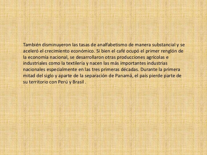 - c. También disminuyeron las tasas de analfabetismo de manera substancial y se aceleró el crecimiento económico. Si bien el café ocupó el primer renglón de la economía nacional, se desarrollaron otras producciones agrícolas e industriales como la textilería y nacen las más importantes industrias nacionales especialmente en las tres primeras décadas. Durante la primera mitad del siglo y aparte de la separación de Panamá, el país pierde parte de su territorio con Perú y Brasil .