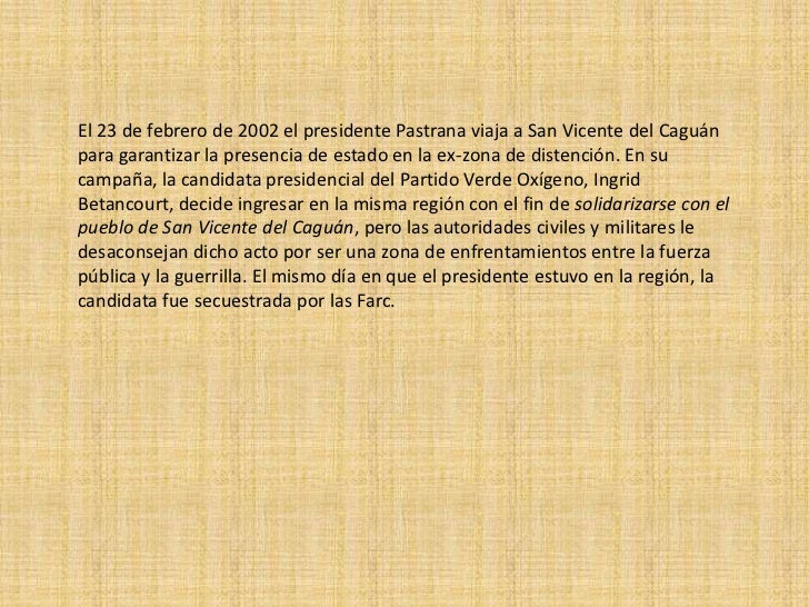 - E. El 23 de febrero de 2002 el presidente Pastrana viaja a San Vicente del Caguán para garantizar la presencia de estado en la ex-zona de distención. En su campaña, la candidata presidencial del Partido Verde Oxígeno, Ingrid Betancourt, decide ingresar en la misma región con el fin de solidarizarse con el pueblo de San Vicente del Caguán, pero las autoridades civiles y militares le desaconsejan dicho acto por ser una zona de enfrentamientos entre la fuerza pública y la guerrilla. El mismo día en que el presidente estuvo en la región, la candidata fue secuestrada por las Farc.