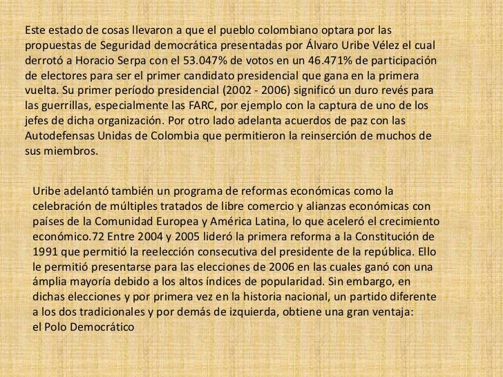 - G. Este estado de cosas llevaron a que el pueblo colombiano optara por las propuestas de Seguridad democrática presentadas por Álvaro Uribe Vélez el cual derrotó a Horacio Serpa con el 53.047% de votos en un 46.471% de participación de electores para ser el primer candidato presidencial que gana en la primera vuelta. Su primer período presidencial (2002 - 2006) significó un duro revés para las guerrillas, especialmente las FARC, por ejemplo con la captura de uno de los jefes de dicha organización. Por otro lado adelanta acuerdos de paz con las Autodefensas Unidas de Colombia que permitieron la reinserción de muchos de sus miembros.Uribe adelantó también un programa de reformas económicas como la celebración de múltiples tratados de libre comercio y alianzas económicas con países de la Comunidad Europea y América Latina, lo que aceleró el crecimiento económico.72 Entre 2004 y 2005 lideró la primera reforma a la Constitución de 1991 que permitió la reelección consecutiva del presidente de la república. Ello le permitió presentarse para las elecciones de 2006 en las cuales ganó con una ámplia mayoría debido a los altos índices de popularidad. Sin embargo, en dichas elecciones y por primera vez en la historia nacional, un partido diferente a los dos tradicionales y por demás de izquierda, obtiene una gran ventaja: el Polo Democrático
