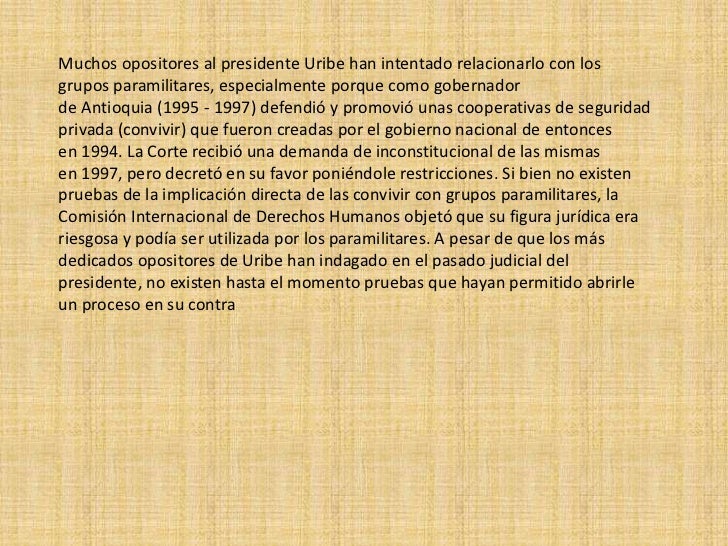 - H. Muchos opositores al presidente Uribe han intentado relacionarlo con los grupos paramilitares, especialmente porque como gobernador de Antioquia (1995 - 1997) defendió y promovió unas cooperativas de seguridad privada(convivir) que fueron creadas por el gobierno nacional de entonces en 1994. La Corte recibió una demanda de inconstitucional de las mismas en 1997, pero decretó en su favor poniéndole restricciones. Si bien no existen pruebas de la implicación directa de las convivir con grupos paramilitares, la Comisión Internacional de Derechos Humanos objetó que su figura jurídica era riesgosa y podía ser utilizada por los paramilitares. A pesar de que los más dedicados opositores de Uribe han indagado en el pasado judicial del presidente, no existen hasta el momento pruebas que hayan permitido abrirle un proceso en su contra