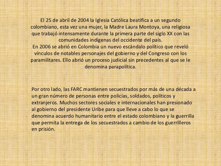 - H. El 25 de abril de 2004 la Iglesia Católica beatifica a un segundo colombiano, esta vez una mujer, la Madre Laura Montoya, una religiosa que trabajó intensamente durante la primera parte del siglo XX con las comunidades indígenas del occidente del país.En 2006 se abrió en Colombia un nuevo escándalo político que reveló vínculos de notables personajes del gobierno y del Congreso con los paramilitares. Ello abrió un proceso judicial sin precedentes al que se le denomina parapolítica.Por otro lado, las FARC mantienen secuestrados por más de una década a un gran número de personas entre policías, soldados, políticos y extranjeros. Muchos sectores sociales e internacionales han presionado al gobierno del presidente Uribe para que lleve a cabo lo que se denomina acuerdo humanitario entre el estado colombiano y la guerrilla que permita la entrega de los secuestrados a cambio de los guerrilleros en prisión.